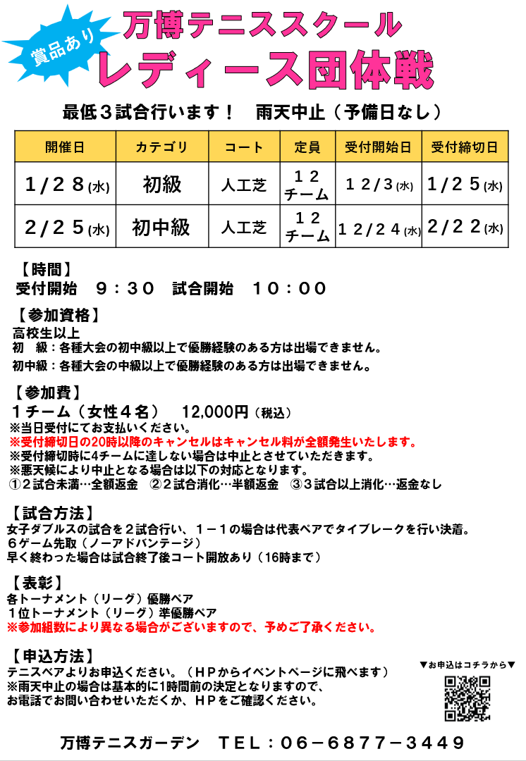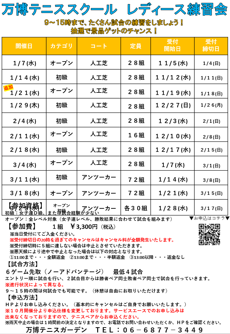 お申込希望の方はイベント名をクリック👇 〈レディース練習会〉 1/7 オープン 1/14 初級 1/21 オープン 2/4 初級 2/11 オープン 2/18 初級 3/4 オープン 3/11 初級 3/18 オープン 3/25 初級 3/25 オープン 〈団体戦〉 1/28団体戦 2/25団体戦 ※10月より申込仕様を変更しております。 テニスベアでの申し込みとなりますので、よろしくお願いいたします。