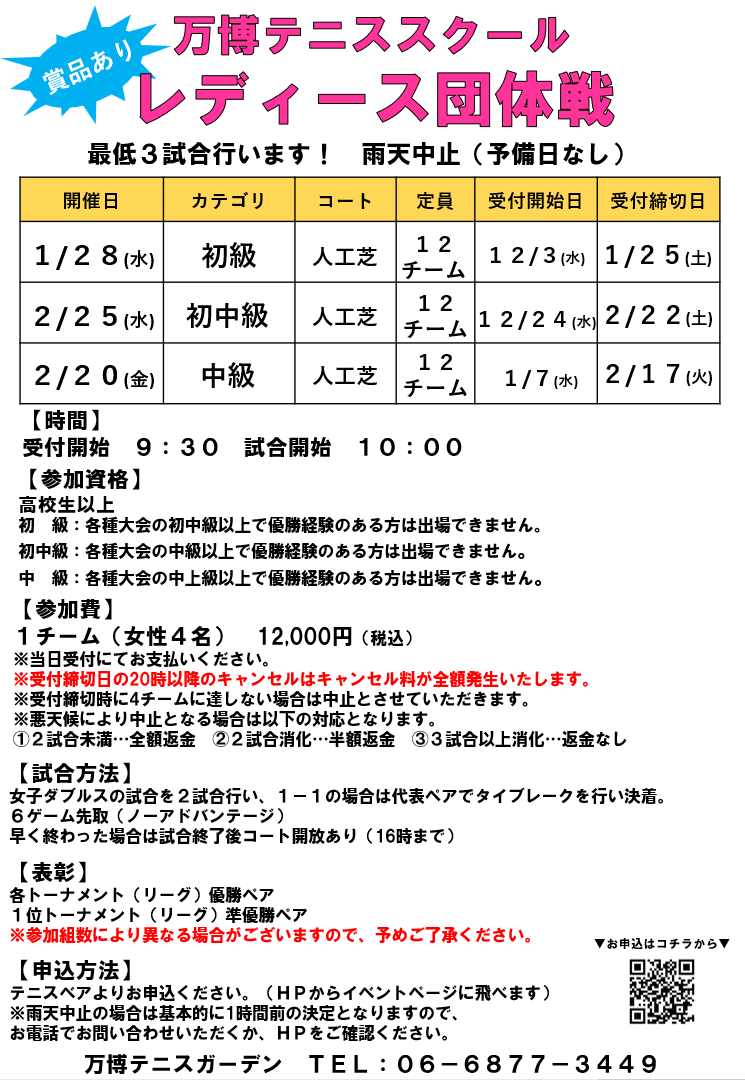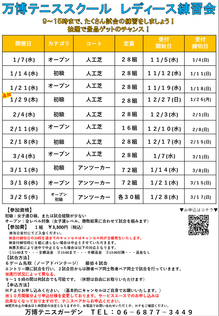 お申込希望の方はイベント名をクリック👇 〈レディース練習会〉 1/7 オープン 1/14 初級 1/21 オープン 1/29 初級 2/4 初級 2/11 オープン 2/18 初級 3/4 オープン 3/11 初級 3/18 オープン 3/25 初級 3/25 オープン 〈団体戦〉 1/28団体戦 2/20団体戦 2/25団体戦 ※10月より申込仕様を変更しております。 テニスベアでの申し込みとなりますので、よろしくお願いいたします。
