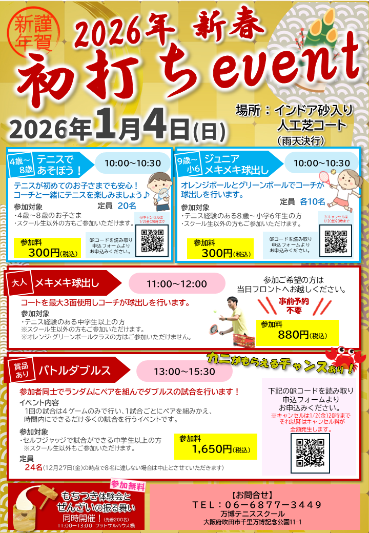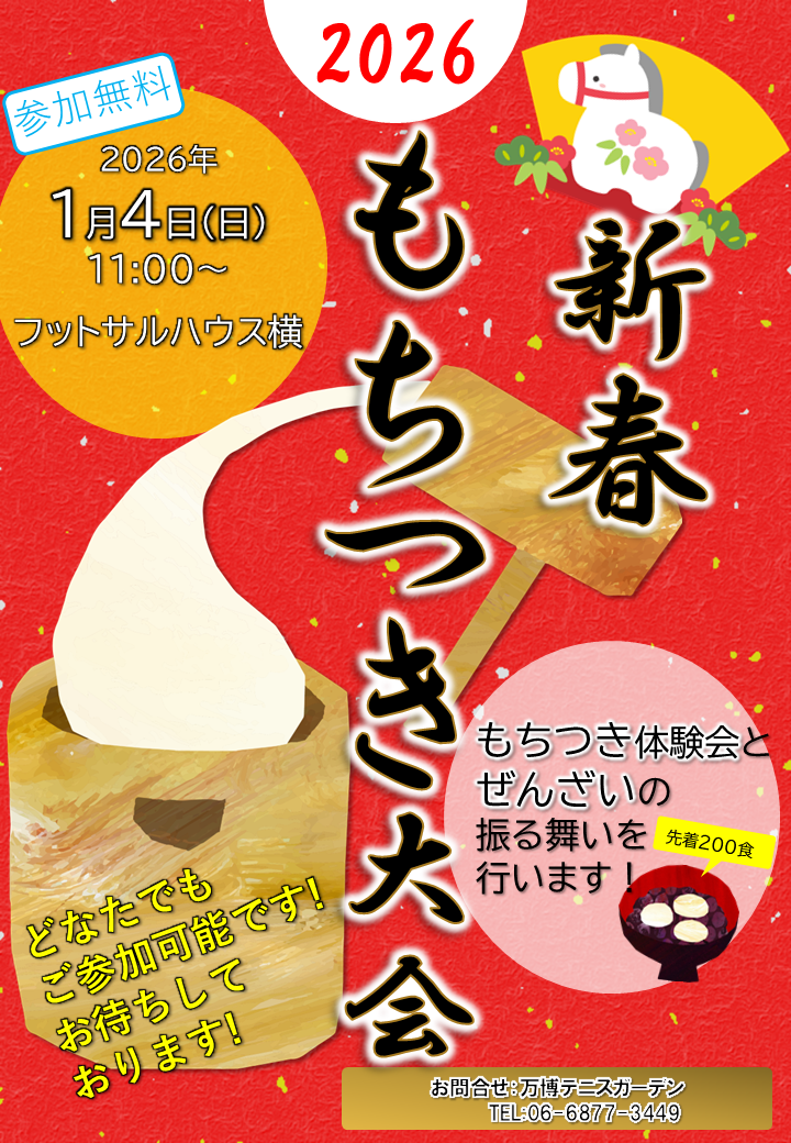 新春初打ちイベント&もちつき大会を開催します! お正月の運動不足を解消しましょう! 大人の方もお子様も大歓迎♪ ▼お申込はこちらより▼ ■テニスであそぼう!(4歳~8歳) ■ジュニアメキメキ球出し(オレンジボール) ■ジュニアメキメキ球出し(グリーンボール) ■新春バトルダブルス