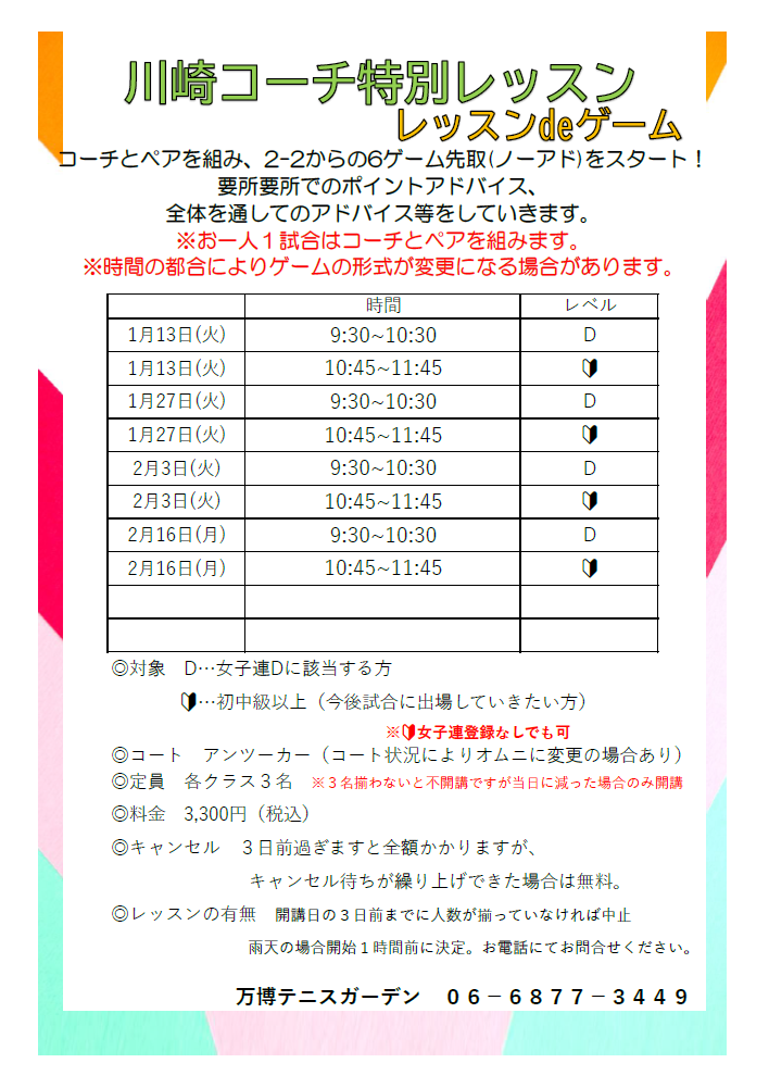川崎コーチ特別レッスン追加スケジュール