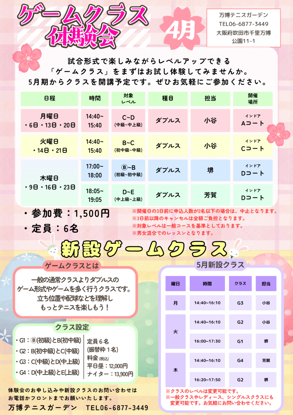 4月も「ゲームクラス体験会」を開催いたします! 【体験会 開催概要】 参加費:1,500円(税込) 定員:各回6名 対象:一般コースのレベルを基準とした男女混合レッスンです。 詳しくは下記チラシをご覧ください!